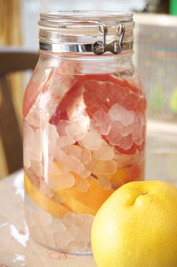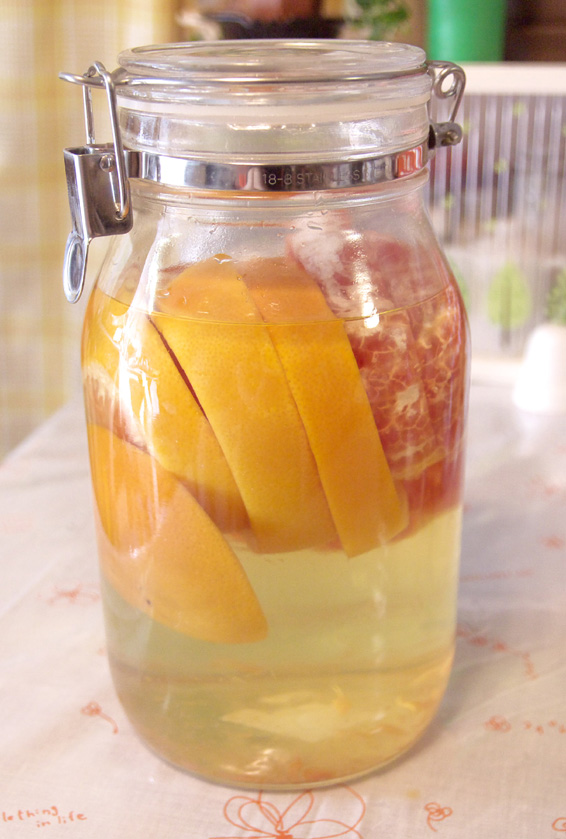 7月15日に漬けたピンクグレープフルーツ酒が2週間を過ぎたので、中の果実を出すことにしました。