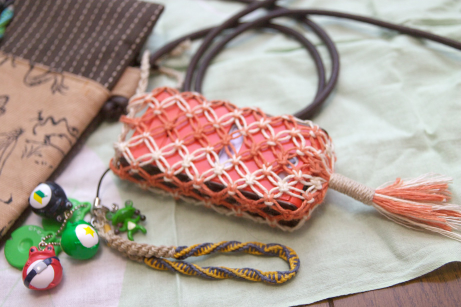 七宝結びで編み編み。和風のバッグに取り付けると、なかなか可愛らしいですv