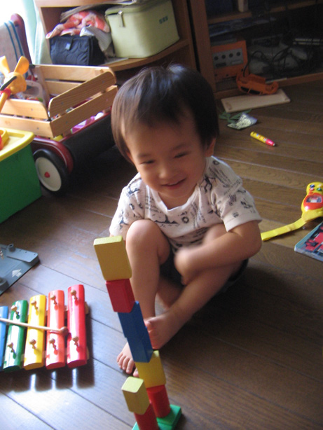 1歳の誕生日に買った積み木…投げたり払ったりするばかりで今ひとつ遊び方が分かってなかったのですが、どうやら「積みあげる」ことを覚えたようです。