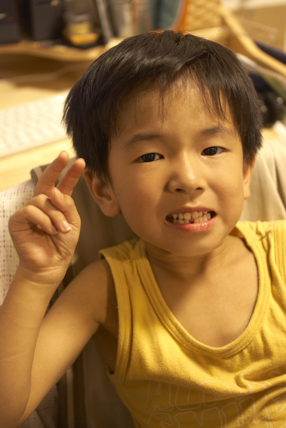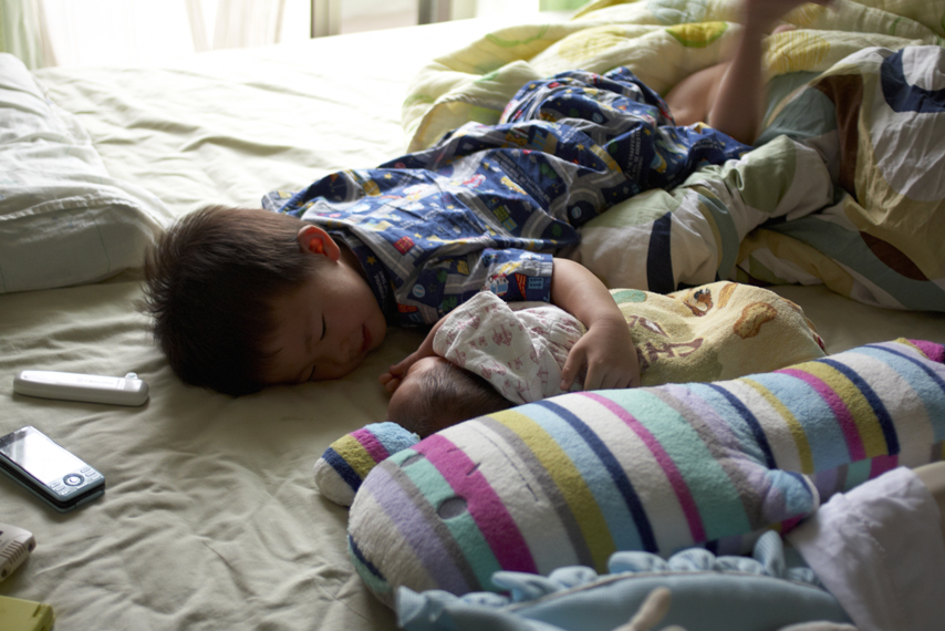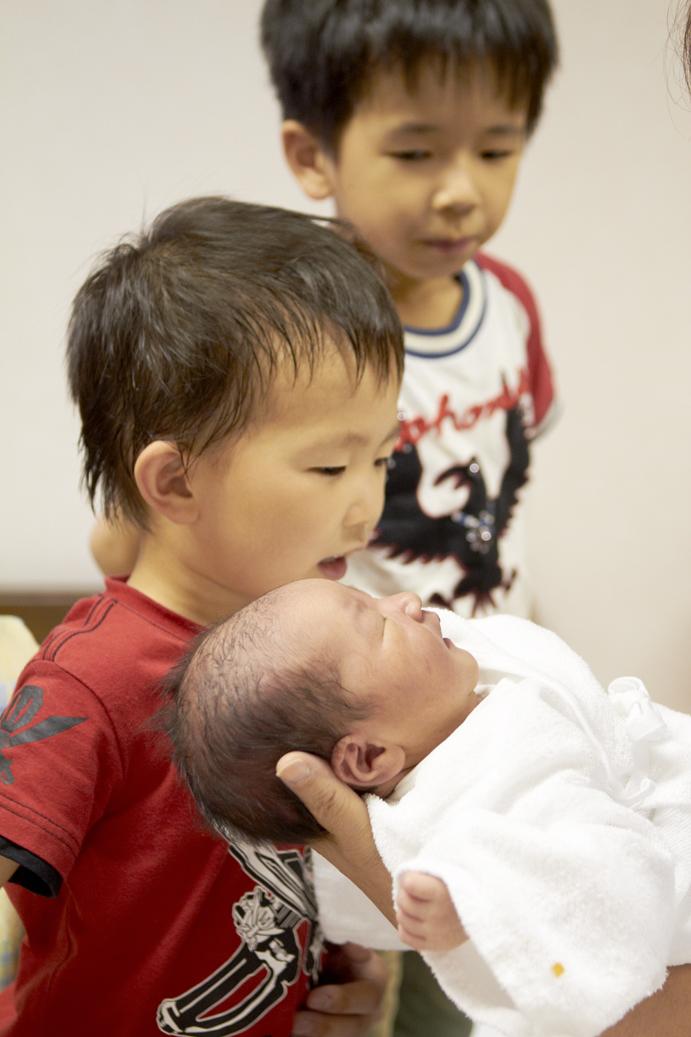 26日におにいちゃんたちと初ふれあい。颯太は恐々。拓巳は興味津々。