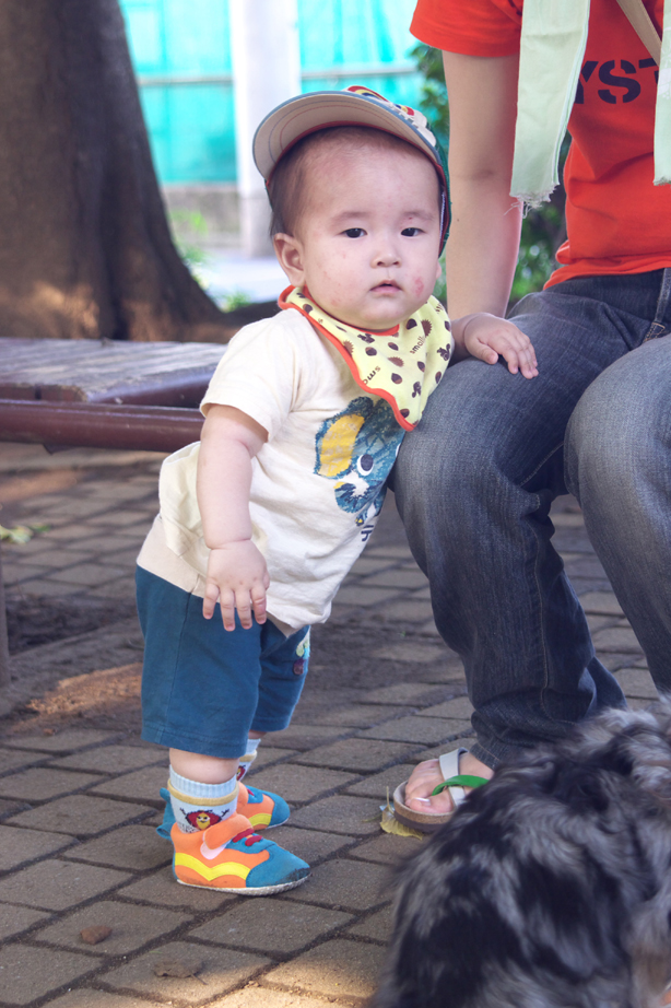 少し離れた場所で犬をつないで息子をベビーカーから下ろしてみました。