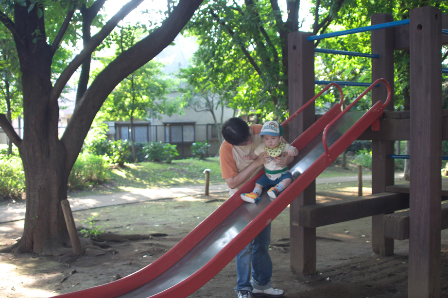 パパと一緒にすべり台。